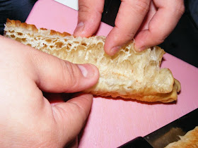 Break cruller pairs into individual crullers. Cut crullers in half (you should have 8 pieces). Slit cruller on the middle so it looks like a hot dog roll.